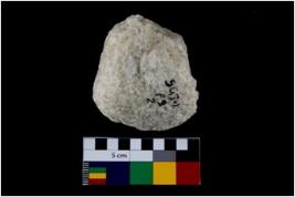 | Description / विवरण | Specimen of a spherical shaped hammer stone with battered surface. |