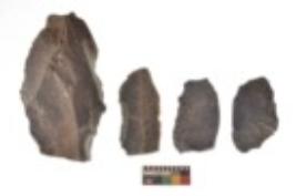 | Description / विवरण | There are n 4 utilized flake cores. There are multi directional irregular scar pattern on both dorsal and ventral face of the flake cores. One is tapering at one end and three have blunted edges. |