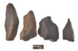 | Description / विवरण | There are n 4 utilized flake cores. There are multi directional irregular scar pattern on both dorsal and ventral face of the flake cores. Three are tapering at one end and one has sharp edge. |