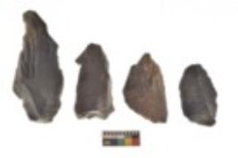 | Description / विवरण | There are n 4 utilized flake cores. There are multi directional irregular scar pattern on both dorsal and ventral face of the flake cores. Three are tapering at one end and one has sharp edge. |