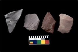 | Description / विवरण | Specimen of flakes tool with prominent flaking marks. It made up of a short flakes with sides trimmed. It is irregular in shaped. |