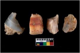 | Description / विवरण | There are n 4 utilized flake cores. There are multi directional irregular scar pattern on them. Three are tapering at one end and one has sharp edge. |