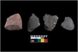 | Description / विवरण | Specimen of flakes tool with prominent flaking marks. It made up of a short flakes with sides trimmed. It is irregular in shaped. |