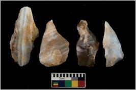 | Description / विवरण | There are n 4 utilized flake cores. There are multi directional irregular scar pattern on them. Three are tapering at one end and one has sharp edge. |