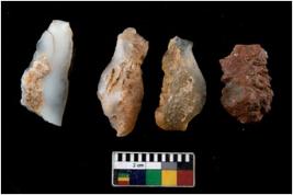 | Description / विवरण | There are n 4 utilized flake cores. There are multi directional irregular scar pattern on them. Three are tapering at one end and one has sharp edge. |
