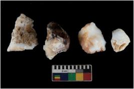 | Description / विवरण | There are n 4 utilized flake cores. There are multi directional irregular scar pattern on them. Three are tapering at one end and one has sharp edge. |
