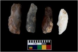 | Description / विवरण | There are n 4 utilized flake cores. There are multi directional irregular scar pattern on them. Three are tapering at one end and one has sharp edge. |