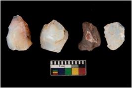 | Description / विवरण | There are n 4 utilized flake cores. There are multi directional irregular scar pattern on them. Three are tapering at one end and one has sharp edge. |