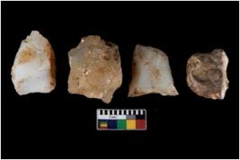 | Description / विवरण | There are n 4 utilized flake cores. There are multi directional irregular scar pattern on them. Three are tapering at one end and one has sharp edge. |