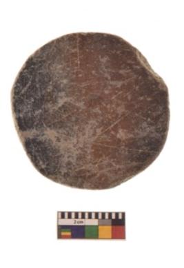 | Description / विवरण | Specimen of ground disc hopscotch made from a red ware. It has jagged edges with sign of chipping. It is rounded in shape. |