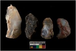 | Description / विवरण | There are n 4 utilized flake cores. There are multi directional irregular scar pattern on them. Three are tapering at one end and one has sharp edge. |
