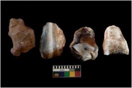 | Description / विवरण | There are n 4 utilized flake cores. There are multi directional irregular scar pattern on them. Three are tapering at one end and one has sharp edge. |