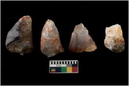 | Description / विवरण | There are n 4 utilized flake cores. There are multi directional irregular scar pattern on them. Three are tapering at one end and one has sharp edge. |