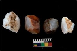 | Description / विवरण | There are n 4 utilized flake cores. There are multi directional irregular scar pattern on them. Three are tapering at one end and one has sharp edge. |