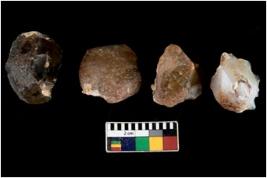 | Description / विवरण | There are n 4 utilized flake cores. There are multi directional irregular scar pattern on them. Three are tapering at one end and one has sharp edge. |