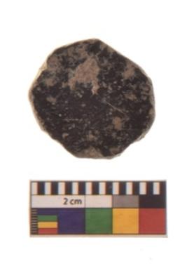 | Description / विवरण | Specimen of ground disc hopscotch made from a black ware. It has jagged edges with sign of chipping. It is rounded in shape. |