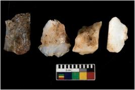 | Description / विवरण | There are n 4 utilized flake cores. There are multi directional irregular scar pattern on them. Three are tapering at one end and one has sharp edge. |
