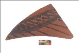 | Description / विवरण | Specimen of Potsherd black on red painted pottery. It is fine fabric in sharp contrast with painted design are executed in black pigment. |