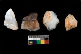 | Description / विवरण | There are n 4 utilized flake cores. There are multi directional irregular scar pattern on them. Three are tapering at one end and one has sharp edge. |