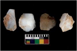 | Description / विवरण | There are n 4 utilized flake cores. There are multi directional irregular scar pattern on them. Three are tapering at one end and one has sharp edge. |