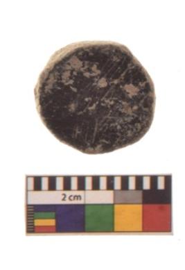 | Description / विवरण | Specimen of ground disc hopscotch made from a black ware. It has jagged edges with sign of chipping. It is rounded in shape. |
