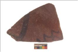 | Description / विवरण | A fragment of a potsherd. It is reddish in colour with black decorative geometric painting on it. |