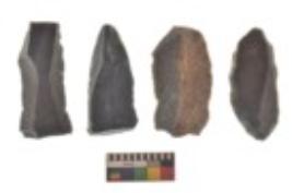 | Description / विवरण | There are n 4 utilized flake cores. There are multi directional irregular scar pattern on both dorsal and ventral face of the flake cores. Three are tapering at one end and one has sharp edge. |