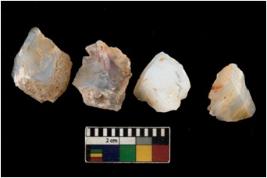 | Description / विवरण | There are n 4 utilized flake cores. There are multi directional irregular scar pattern on them. Three are tapering at one end and one has sharp edge. |
