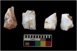| Description / विवरण | There are n 4 utilized flake cores. There are multi directional irregular scar pattern on them. Three are tapering at one end and one has sharp edge. |