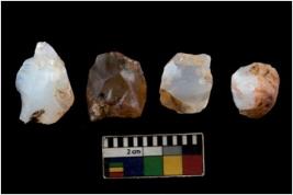 | Description / विवरण | There are n 4 utilized flake cores. There are multi directional irregular scar pattern on them. Three are tapering at one end and one has sharp edge. |