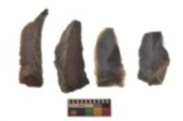 | Description / विवरण | There are n 4 utilized flake cores. There are multi directional irregular scar pattern on both dorsal and ventral face of the flake cores. Three are tapering at one end and one has sharp edge. |