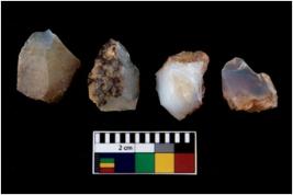 | Description / विवरण | There are n 4 utilized flake cores. There are multi directional irregular scar pattern on them. Three are tapering at one end and one has sharp edge. |