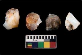 | Description / विवरण | There are n 4 utilized flake cores. There are multi directional irregular scar pattern on them. Three are tapering at one end and one has sharp edge. |