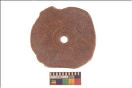 | Description / विवरण | Specimen of terracotta Wheel. It is red ware rounded shape with center perforation. |