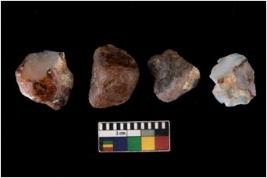 | Description / विवरण | There are n 4 utilized flake cores. There are multi directional irregular scar pattern on them. Three are tapering at one end and one has sharp edge. |