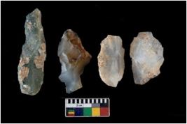 | Description / विवरण | There are n 4 utilized flake cores. There are multi directional irregular scar pattern on them. Two are tapering at one end and two have sharp edges. |