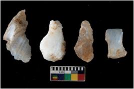 | Description / विवरण | There are n 4 utilized flake cores. There are multi directional irregular scar pattern on them. Three are tapering at one end and one has sharp edge. |