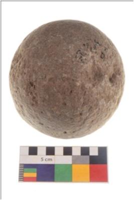 | Description / विवरण | Specimen of a spherical shaped hammer stone with battered surface. |