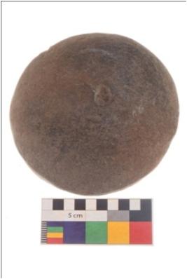 | Description / विवरण | Specimen of a spherical shaped hammer stone with battered surface. |