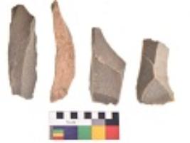| Description / विवरण | There are n 4 utilized flake cores. There are multidirectional irregular dominant scar pattern on both dorsal and ventral face of the flake cores. Two are tapering at one end and two have sharp edges. |