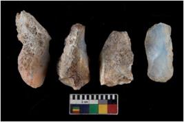 | Description / विवरण | There are n 4 utilized flake cores. There are multi directional irregular scar pattern on them. Three are tapering at one end and one has sharp edge. |