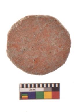 | Description / विवरण | A partially broken specimen of red ware disc with rounded and smooth edge and flat surface. It is having smooth surface areas other side is rough. |