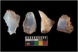 | Description / विवरण | There are n 4 utilized flake cores. There are multi directional irregular scar pattern on them. Three are tapering at one end and one has sharp edge. |