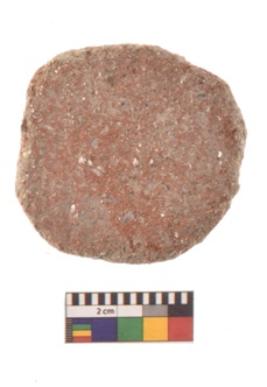 | Description / विवरण | A partially broken specimen of red ware disc with rounded and smooth edge and flat surface. It is having smooth surface areas other side is rough. |