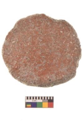 | Description / विवरण | A partially broken specimen of red ware disc with rounded and smooth edge and flat surface. It is having smooth surface areas other side is rough. |