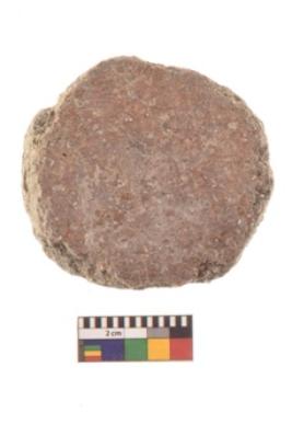 | Description / विवरण | A partially broken specimen of red ware disc with rounded and smooth edge and flat surface. It is having smooth surface areas other side is rough. |