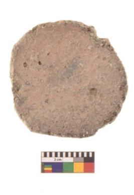 | Description / विवरण | Specimen of ground disc hopscotch made from a red ware. It has jagged edges with sign of chipping. It is rounded in shape. |