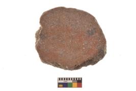 | Description / विवरण | Specimen of ground disc hopscotch made from a red ware. It has jagged edges with sign of chipping. It is rounded in shape. |
