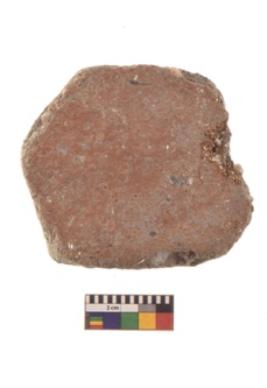 | Description / विवरण | Specimen of ground disc hopscotch made from a red ware. It has jagged edges with sign of chipping. It is rounded in shape. |