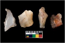 | Description / विवरण | There are n 4 ; worked utilized flakes; there are multidirectional irregular scar pattern on both dorsal and ventral face of the flakes. Two are tapering at one end. All are having sharp edges. |